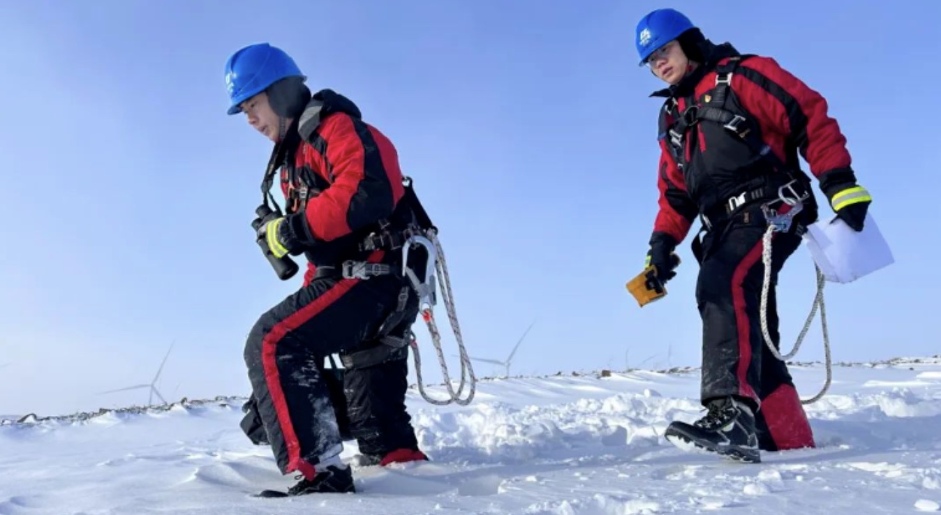 在最高氣溫只有零下26攝氏度河北張家口沽源縣,華電冀北新能源馳盛風(fēng)電場的運維員工,冒著寒風(fēng)對輸配電線路進行特巡,及時啟動極寒天氣應(yīng)急預(yù)案,通過“可視化+無人機+人工巡檢”的方式,開展線路及站內(nèi)設(shè)備特巡,加強設(shè)備監(jiān)控和消缺。