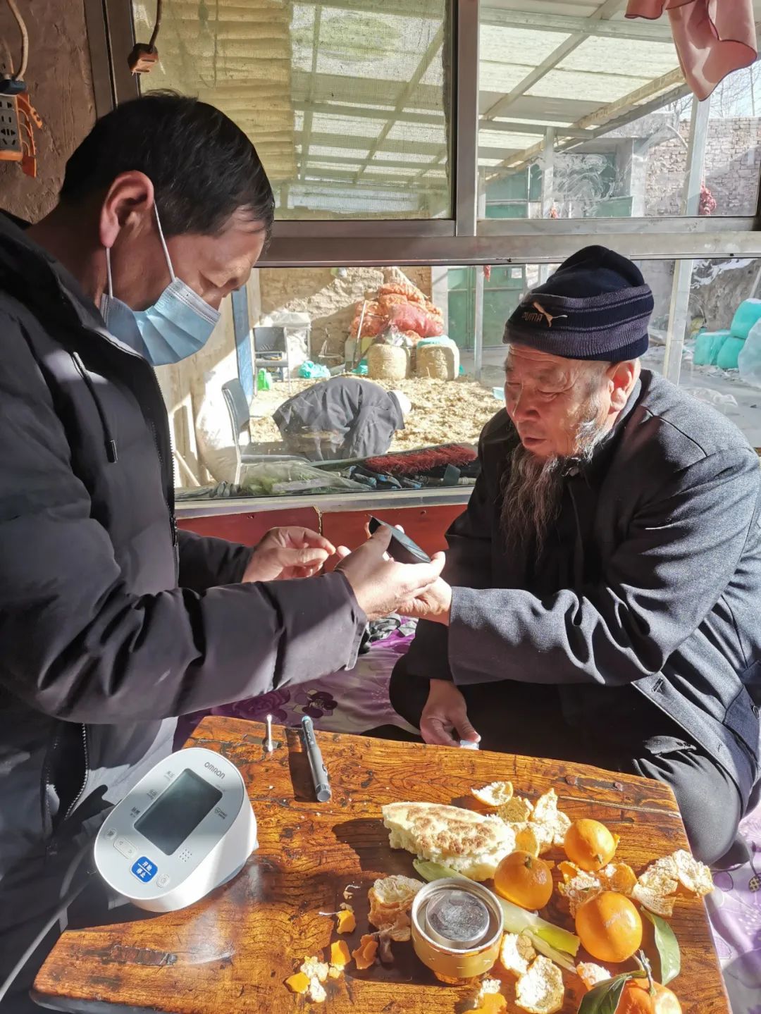 青海省投駐村隊(duì)主動(dòng)聯(lián)系村醫(yī)為老人測(cè)血壓血糖