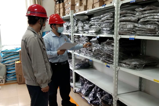 圖為該公司人員正在檢查職業(yè)危害防護(hù)用品配備情況