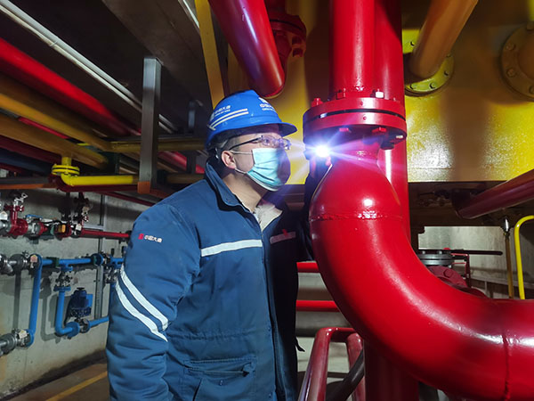 陳東汛在生產現(xiàn)場檢查設備設施