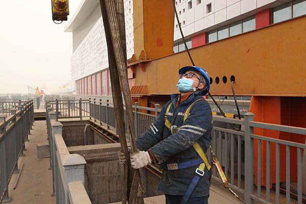 一線職工地面指揮起重門機(jī)運(yùn)行