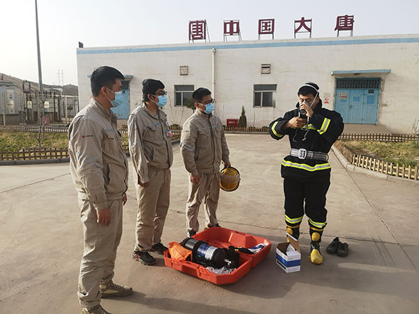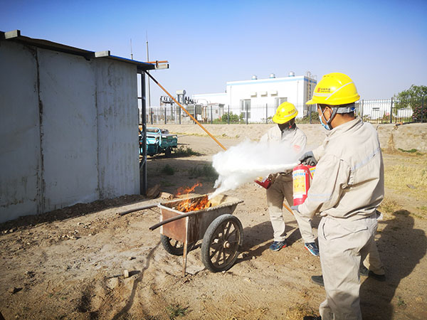 首先開展的是干粉滅火器實(shí)操演練。運(yùn)維人員取出4具即將送檢的滅火器,用小推車裝好干柴放置在空曠地點(diǎn),駐站人員講解了滅火器檢查方法和使用流程后,在確保安全的情況下將小推車內(nèi)的干柴點(diǎn)燃。一名工作人員用滅火器將車內(nèi)的火焰撲滅,再重新點(diǎn)燃,下一名人員繼續(xù)操作,最終達(dá)到參訓(xùn)人員全部能夠熟練使用滅火器的目的;其次,開展正壓呼吸器使用實(shí)操演練。在每個(gè)人都熟練掌握說明書上使用步驟和注意事項(xiàng)后,每名工作人員都穿戴正壓呼吸器一次,如果穿戴流程錯(cuò)誤立即糾正并重新穿戴;再次,開展消防戰(zhàn)斗服穿戴實(shí)操演練。有火電消防工作經(jīng)驗(yàn)的人員對(duì)戰(zhàn)斗服使用步驟進(jìn)行詳細(xì)講解,每名工作人員都穿戴消防戰(zhàn)斗服一次,達(dá)到全員均能熟練穿戴的目的;最后,所有參訓(xùn)人員都組裝并佩戴防毒面具一次。