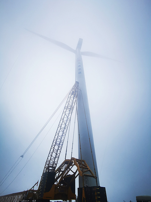 該項目自2021年8月2日全面開工建設以來,全員克服時間緊、任務重,以及夏季長時間高溫、近期溫度驟降、山上風力較大等重重困難,縝密部署,團結拼搏,以扎實的管理、良好的協(xié)調(diào)、有力的措施,特別是針對作業(yè)高峰期充分討論、采取舉措,在大件運輸、吊裝等工作中做到了有方案、有計劃、有落實。經(jīng)過節(jié)假無休、連續(xù)作戰(zhàn),先后完成了十臺風機基礎澆筑工作,并于10月13日正式完成首臺風機吊裝工作,呈現(xiàn)出“驕陽壁嶺轟聲震,崇山風嘯鐵臂搖”的一派火熱建設局面。