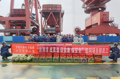 中國電力網(wǎng)訊 清涼度盛夏,安康伴我行。7月28日,安徽大唐電力檢修運營有限公司工會負責人赴當涂碼頭項目部開展“送清涼 戰(zhàn)高溫 保安全”慰問活動,為奮戰(zhàn)在高溫一線的項目部員工送去防暑降溫物品,傳遞組織的關(guān)心關(guān)愛。