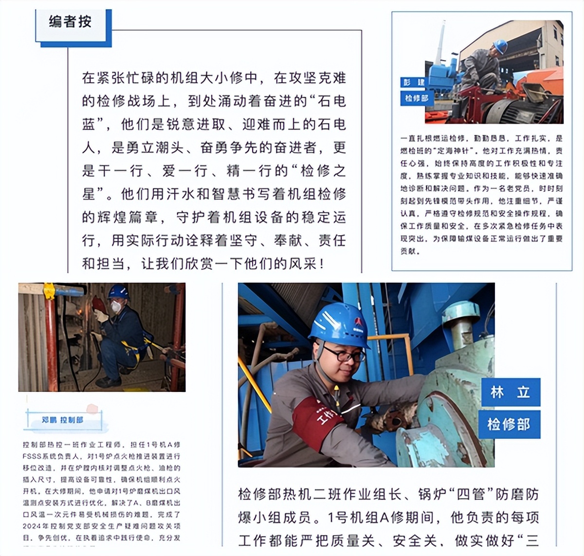 榜樣是精神、是力量。為大力宣揚(yáng)機(jī)組檢修期間的先進(jìn)典型和優(yōu)秀事跡,該公司在檢修班組間開(kāi)展“檢修之星”評(píng)比活動(dòng),以“檢修之星”的楷模表率,激發(fā)檢修班組員工比學(xué)趕超、奮勇?tīng)?zhēng)先的熱情和干勁。為確保“檢修之星”評(píng)選工作取得實(shí)效,該公司制定了“檢修之星”評(píng)選方法,明確了評(píng)星必備條件、主要指標(biāo)以及評(píng)選過(guò)程,“檢修之星”的人選由檢修班組各推選一名,條件是能夠按質(zhì)按量完成工作任務(wù),在機(jī)組大小修中表現(xiàn)出色,能夠起到模范帶頭作用的人員。經(jīng)綜合評(píng)選,該公司共評(píng)選出10名“檢修之星”員工,并通過(guò)企業(yè)網(wǎng)站、微信公眾號(hào)、宣傳展板等進(jìn)行集中宣傳展示。