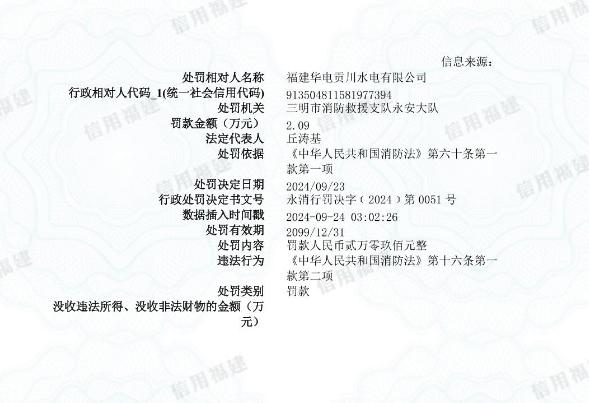 近日,福建華電貢川水電有限公司因相關(guān)違法行為,被三明市消防救援支隊(duì)永安大隊(duì)罰款。