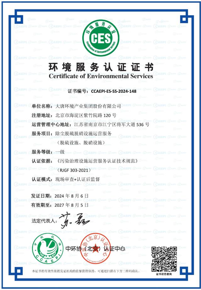 中國電力網訊(通訊員 黃婉婉)10月16日,大唐環(huán)境特許經營分公司收到中環(huán)協(xié)(北京)認證中心頒發(fā)的“除塵脫硫脫硝設施運營服務”一級服務認證證書。這一殊榮不僅是對環(huán)境公司及分公司在脫硫脫硝領域專業(yè)能力的肯定,更是對其長期致力于環(huán)境保護事業(yè)、推動綠色可持續(xù)發(fā)展努力的認可。
