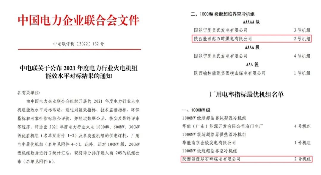 中國(guó)電力網(wǎng)訊 6月29日,從中電聯(lián)傳來(lái)喜訊,趙石畔煤電公司2號(hào)機(jī)組榮獲2021年度電力行業(yè)1000MW級(jí)超超臨界空冷機(jī)組指標(biāo)對(duì)標(biāo)“AAAAA級(jí)優(yōu)勝機(jī)組”及“廠用電率指標(biāo)最優(yōu)機(jī)組”。