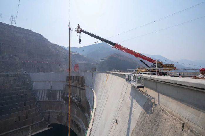 經(jīng)過數(shù)小時(shí)的緊張操作,世界上最長(zhǎng)的低熱混凝土芯樣從白鶴灘壩體高程796.76米處取緩緩拔出,直至提升到高程833.5米脫離壩體,共穿過13個(gè)澆筑倉號(hào),73個(gè)澆筑坯層,25層冷卻水管,最終順利取出并成功吊裝固定。