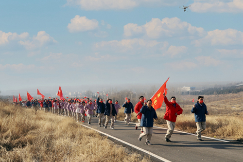 徒步隊伍精神飽滿、興致高昂、闊步向前,走出廠門后從虎山腳下沿黃營村棗林觀光道向上前行。途經(jīng)之處生態(tài)風景獨特、空氣凌冽清澈,全體人員邁著矯健的步伐、排著整齊的隊伍、揮舞著鮮艷的國旗,激情迸發(fā)、活力四射,徒步完成近7公里的路程,在碧空湛藍、冬陽高照的風景里,描繪了一幅幅團結一心、眾志成城的拼搏畫面。