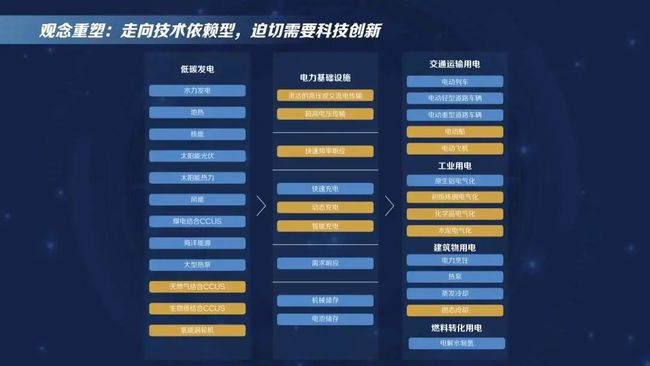 國(guó)際能源署(IEA)給出的技術(shù)評(píng)估,分別對(duì)低碳發(fā)電、電力基礎(chǔ)設(shè)施、交通運(yùn)輸用電、工業(yè)用電、建筑物用電、燃料轉(zhuǎn)化用電等技術(shù)做了梳理分析,在低碳發(fā)電領(lǐng)域像太陽(yáng)能光伏發(fā)電等技術(shù)已經(jīng)基本比較成熟,可以走向市場(chǎng);在電力基礎(chǔ)設(shè)施領(lǐng)域,智能充電等技術(shù)目前還需要進(jìn)一步研發(fā)、競(jìng)爭(zhēng),才能推向市場(chǎng)。IEA2021年的最新報(bào)告顯示在全球能源行業(yè)的路線圖里,2050年實(shí)現(xiàn)凈零排放的關(guān)鍵技術(shù)中,50%目前尚未成熟,需要進(jìn)一步研發(fā)提升,可見(jiàn)走向技術(shù)依賴型的經(jīng)濟(jì)發(fā)展模式對(duì)科技創(chuàng)新的需求更加迫切。