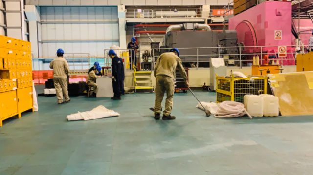 在大修尾聲,我又看到了一個背影。他正背對著我,一絲不茍地清潔著剛剛“撤場”完畢后的地面,發(fā)揮著工完料盡場地清的傳統(tǒng)“藝能”——他的衣服已經(jīng)汗透,緊緊地貼在背上,我看不見他的臉,卻依然尊敬地對著他,舉起了相機。