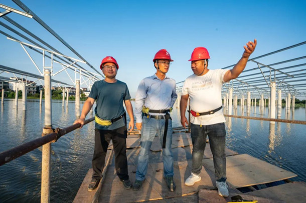 “從乘浮船‘踩點(diǎn)’開始,工作盡量提前,凡事親力親為,特別是三伏天后天氣超熱,我們避開最熱時(shí)段,早上4點(diǎn)就到現(xiàn)場,業(yè)主心疼我,我心疼工友,工友自然干勁足。打樁效率、質(zhì)量直接關(guān)系到后續(xù)光伏面板安裝進(jìn)度和全容量并網(wǎng)任務(wù),不打好提前量,對(duì)不起業(yè)主方的信任厚愛……”,7月16日,茶從湖標(biāo)段已打完4800余根樁基,完成80%以上的任務(wù),光伏面板安裝進(jìn)度超20%。8月15日再找他時(shí),早已在江埠項(xiàng)目堯咀光伏區(qū)鏖戰(zhàn)了。