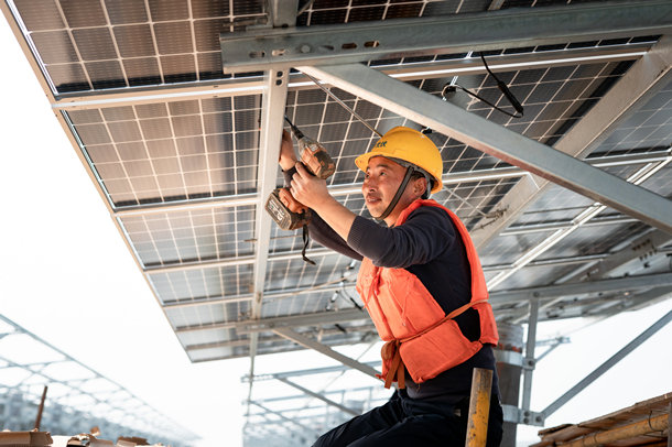 7分鐘,張志輝擰緊了光伏面板支架上的最后一顆螺栓,被汗水浸潤的古銅色臉龐上露出勝利的笑容;