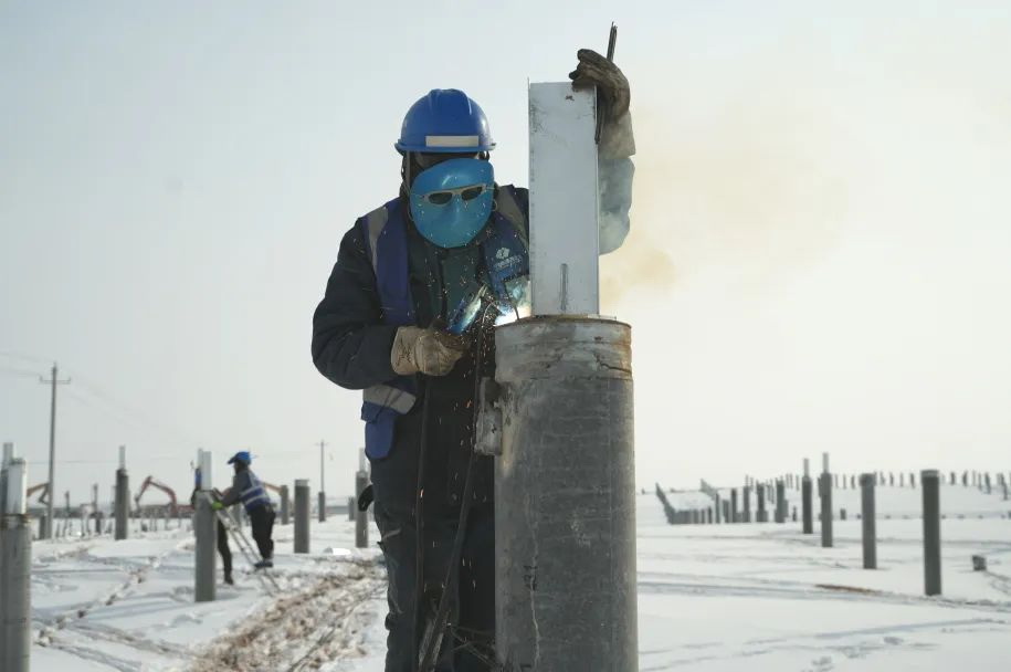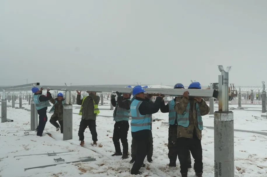 茫茫的沙海里,迎著凜冽寒風,踩在厚厚的積雪里,項目經(jīng)理李超翔和土建經(jīng)理張國睿的鞋子已濕透了,他們和施工單位、監(jiān)理單位值班人員一起,一如往常,一絲不茍地堅守在崗位上,仔細地檢查著預制管樁校準、焊樁頭和裝支架的工程質量,叮囑施工人員要把控好安全和質量。