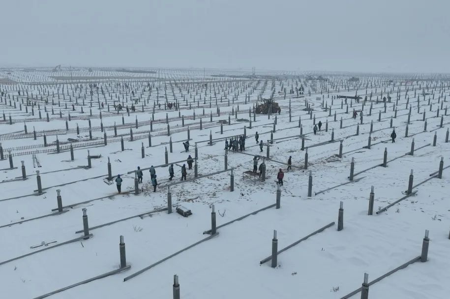 踩著積雪,站在被雪覆蓋的沙丘上,已經(jīng)打好的光伏樁整齊地排列在沙地里,像嚴陣以待的戰(zhàn)士,只待深藍色的光伏板賦身,便可將沙漠吞噬。