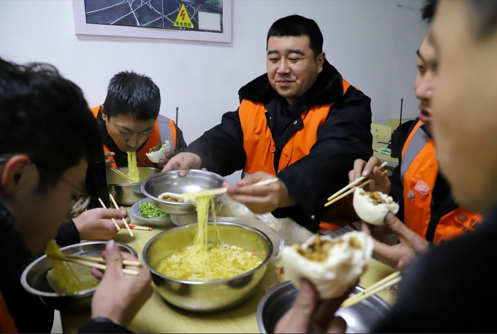檢車員們列著整齊的隊伍滿心歡喜地奔向待檢室,圍坐在臨時飯桌旁,他們那一雙雙因長時間戶外作業(yè)而黝黑、僵硬的手,與桌上潔白的筷子形成鮮明對比。餐桌上的面條、饅頭和加熱的菜肴雖簡單,卻在寒夜中散發(fā)著溫暖。