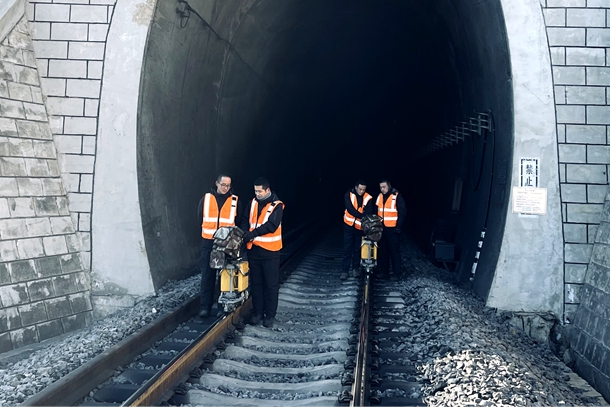 圖為作業(yè)人員對隧道口線路進(jìn)行鋼軌探傷作業(yè)