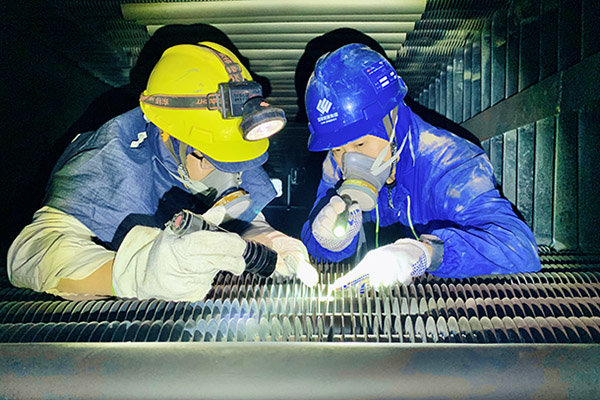 圖為鍋爐專(zhuān)業(yè)點(diǎn)檢人員正在進(jìn)行省煤器區(qū)域防磨防爆檢查