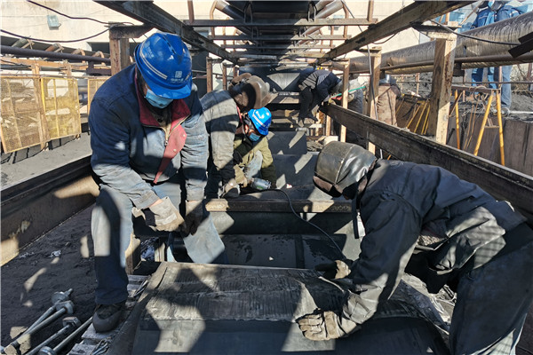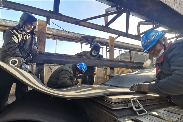 5日上午,工作人員做好粘接皮帶準(zhǔn)備工作,負(fù)責(zé)這次搶修工作的皮帶班,目前編制只有三名職工,承擔(dān)此次工作,顯然兩天內(nèi)完不成皮帶粘接任務(wù),燃運分場打破常規(guī),合理分配人員,調(diào)派分場其他班組支援搶修,在剛剛完成三天搶修任務(wù)的情況下,克服困難繼續(xù)投入到搶修中。他們分工作業(yè)、分組負(fù)責(zé),一組用電火焊、導(dǎo)鏈、撬棍等工具修復(fù)皮帶滾筒,一組對斷裂皮帶進(jìn)行切割、打磨、對口、清洗、粘接和硫化等處理,同樣是在室外寒冷天氣搶修,汗水浸濕了他們的衣領(lǐng)和帽子,加上空間狹小,他們克服了重重困難,團(tuán)結(jié)作戰(zhàn),中午來不及休息,午飯后又繼續(xù)搶修工作,沒有一個人叫苦叫累,以頑強(qiáng)的毅力完成了當(dāng)天的皮帶粘接任務(wù)。