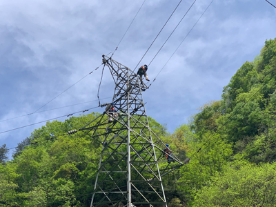 此次維保檢修的二郎壩發(fā)電35kV臥天架空輸配電線路全長(zhǎng)約18公里,共有桿塔43級(jí),其中鐵塔22級(jí),混凝土水泥桿塔21級(jí),均為山區(qū)架空線路,且位于陜南山區(qū),叢林密布、道路濕滑,檢修維保工作難度大。施工前,電力運(yùn)營(yíng)提前抽調(diào)專業(yè)技術(shù)人員對(duì)現(xiàn)場(chǎng)情況進(jìn)行實(shí)地勘察,就天氣情況、檢修方案、危險(xiǎn)點(diǎn)進(jìn)行分析討論,梳理設(shè)備缺陷隱患,并制定了完善的檢修方案及“三措兩案”。檢修人員披荊斬棘、逐桿逐級(jí)檢修,共計(jì)消除桿塔金具缺陷339條、更換破損絕緣子5片、更換避雷器1組,有效地提高了輸電線路設(shè)備的健康和運(yùn)行水平,以優(yōu)質(zhì)、高效的檢修成果確保了業(yè)主方輸電線路安全可靠運(yùn)行。