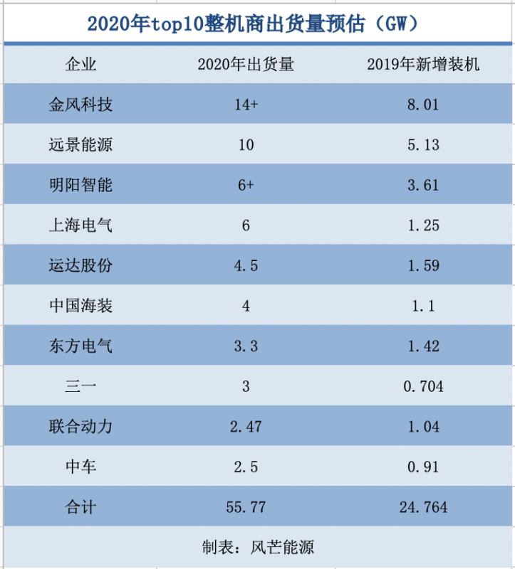 根據(jù)風(fēng)芒能源問詢、統(tǒng)計(jì)以及預(yù)估,2020年全年,排名前十的整機(jī)商出貨量將超過50GW左右。相較于光伏行業(yè)動(dòng)態(tài)變化的集中趨勢,風(fēng)電整機(jī)商的排名及市占率基本保持穩(wěn)定。其中,TOP3的整機(jī)商金風(fēng)科技、遠(yuǎn)景能源、明陽智能累計(jì)出貨量超過30GW,三家市場占比最終預(yù)計(jì)在60%左右,與2019年的62.6%比,雖受搶裝影響,三家市占率稍有減弱,但行業(yè)集中度基本未受影響。