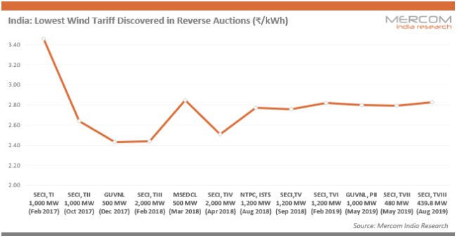 根據(jù)Mercom India Research的數(shù)據(jù),由于招標(biāo)不足,2019財(cái)年已招標(biāo)了超過(guò)5吉瓦的風(fēng)能項(xiàng)目,其中2019年迄今為止已拍賣(mài)了3吉瓦的風(fēng)能項(xiàng)目。2019年,平均風(fēng)電稅率為每千瓦時(shí)2.80盧比(約合0.039美元)。 Mercom去年報(bào)告稱(chēng),自電子逆向拍賣(mài)啟動(dòng)以來(lái),截至2018年12月,已拍賣(mài)了約9.5吉瓦的風(fēng)能項(xiàng)目。
