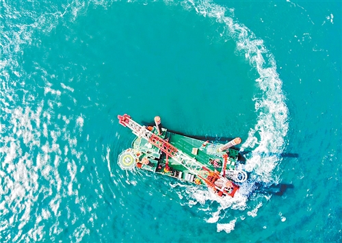 12月16日,由中國鐵建港航局集團有限公司投資打造的國內(nèi)首艘1300噸自升自航式風電安裝船“鐵建風電01”在江蘇啟東交付使用。圖為“鐵建風電01”大回轉(zhuǎn)試驗。陳耀金攝(中經(jīng)視覺)