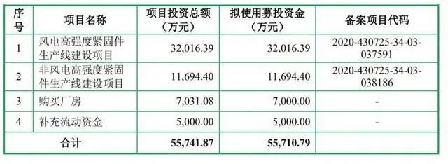 本次IPO,飛沃科技公開發(fā)行A股股票1347萬股,發(fā)行價格72.5元/股,募集資金總額約為9.77億元,擬用于風(fēng)電高強度緊固件生產(chǎn)線建設(shè)項目、非風(fēng)電高強度緊固件生產(chǎn)線建設(shè)項目、購買廠房、補充流動資金等。