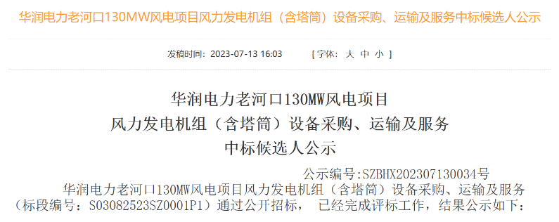 公告顯示,第一中標候選人:三一重能股份有限公司,投標價格:283370000.00元。第二中標候選人:新疆金風(fēng)科技股份有限公司,投標價格:285439400.00元。