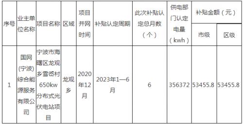 根據(jù)《寧波市家庭屋頂光伏補(bǔ)貼專(zhuān)項(xiàng)資金管理暫行辦法》(甬發(fā)改能源〔2018〕36號(hào))、《海曙區(qū)節(jié)能降耗專(zhuān)項(xiàng)資金管理辦法》(海發(fā)改〔2019〕36號(hào))等文件精神,海曙區(qū)2023年上半年符合非自然人家庭屋頂光伏發(fā)電補(bǔ)貼項(xiàng)目共1個(gè),總并網(wǎng)容量650kw,2023年上半年補(bǔ)貼發(fā)電周期為2023年1月1日至2023年6月30日,合計(jì)發(fā)電量356372千瓦時(shí),需撥付補(bǔ)貼資金106911.6元(其中:市級(jí)補(bǔ)貼資金53455.8元,區(qū)級(jí)配套補(bǔ)助資金53455.8元)。