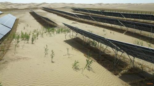 荒漠化一直是國家西部發(fā)展最大阻礙,西部治沙一直是國家的百年大計(jì),近年來,國家投注了大量精力和資金治沙,一直在不斷的探索治沙新模式。光伏治沙是二十一世紀(jì)第二個(gè)十年最新探索出的成果。中國電建集團(tuán)山東電建一公司德益公司積極擔(dān)當(dāng)作為,開展沙漠防沙固沙生態(tài)治理,在廠區(qū)迎風(fēng)面及光伏方陣,種植140萬平草方格,即用麥草、葦桿等材料在沙漠中扎成1米乘1米的正方形方格形狀,當(dāng)氣流或風(fēng)沙流經(jīng)沙障時(shí),產(chǎn)生渦旋并伴有積沙現(xiàn)象,經(jīng)過充分蝕積,形成較為光滑凹曲面,削弱風(fēng)沙的侵蝕,有效實(shí)現(xiàn)板上發(fā)電,板下治沙改土,減緩沙丘流動(dòng),減少水分蒸發(fā),為固沙植物存活創(chuàng)造良好條件。