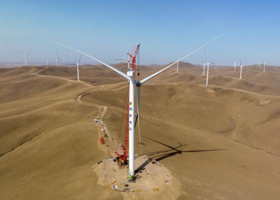 圖為霍林河循環(huán)經(jīng)濟示范工程火電靈活性改造促進市場化消納新能源試點項目30萬千瓦風(fēng)電項目施工現(xiàn)場,風(fēng)機葉輪正在吊裝 圖片來源:國家電投內(nèi)蒙古公司