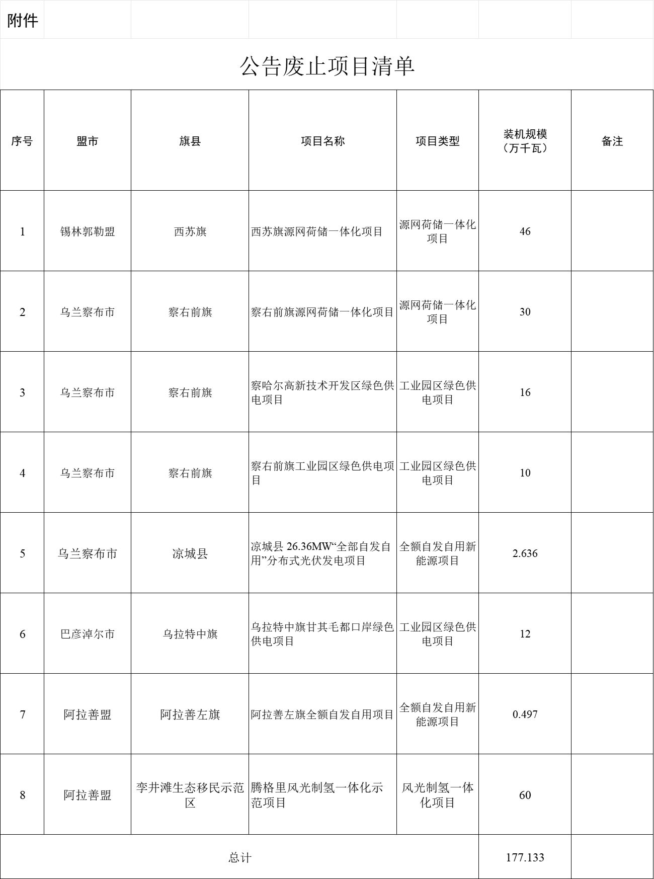為全面實行市場化新能源項目“能進、能出”機制,企業(yè)可隨時申報市場化并網(wǎng)新能源項目,也可隨時申請廢止已獲批但難以推進的市場化并網(wǎng)新能源項目,避免無法實施的新能源項目圈占土地等資源。根據(jù)工作安排,對2023年11月1日至2024年1月31日各盟市廢止的市場化并網(wǎng)新能源項目進行公告,共計1.77GW新能源項目被廢止。