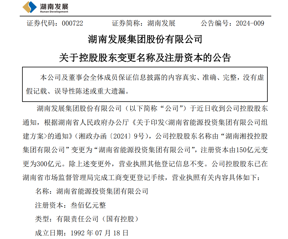 公告顯示,湖南發(fā)展于近日收到公司控股股東通知,根據(jù)湖南省人民政府辦公廳《關(guān)于印發(fā)<湖南省能源投資集團(tuán)有限公司組建方案>的通知》(湘政辦函〔2024〕9號(hào)),公司控股股東名稱由“湖南湘投控股集團(tuán)有限公司”變更為“湖南省能源投資集團(tuán)有限公司”,注冊(cè)資本由150億元變更為300億元。除上述變更外,營(yíng)業(yè)執(zhí)照其他登記信息不變。公司控股股東已在湖南省市場(chǎng)監(jiān)督管理局完成工商變更登記手續(xù)。