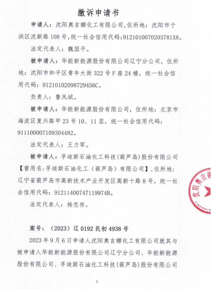 2024年8月13日下午,中國風(fēng)電潤滑油龍頭企業(yè)沈陽奧吉娜化工有限公司(下稱:奧吉娜公司)訴華能新能源股份有限公司遼寧分公司(下稱:華能新能源遼寧分公司或被告一)、華能新能源股份有限公司和孚迪斯石油化工(葫蘆島)有限公司(下稱:被告三)招投標(biāo)串通案(案號(hào):(2023)遼 0192 民初 4938號(hào)),定在沈陽高新技術(shù)產(chǎn)業(yè)開發(fā)區(qū)人民法院自由貿(mào)易試驗(yàn)區(qū)人民法庭第三次開庭,開庭前奧吉娜公司遞交了撤訴申請(qǐng)書,法院裁定準(zhǔn)許撤訴。
