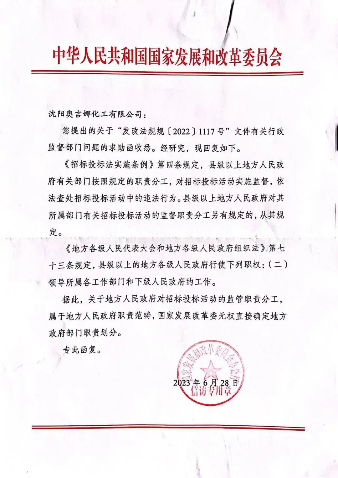 原告曾就被告一和被告三串通投標(biāo)赤裸裸的違法行為多方尋求監(jiān)督部門監(jiān)管,但一直求告無門,無奈向國家發(fā)展和改革委員會(huì)投訴,經(jīng)國家發(fā)展和改革委員會(huì)回函“地方人民政府對(duì)招標(biāo)投標(biāo)活動(dòng)的監(jiān)管職責(zé)分工,屬于地方人民政府職責(zé)范疇,國家發(fā)展改革委無權(quán)直接確定地方政府部門職責(zé)劃分”(下附國家發(fā)改委回函)。