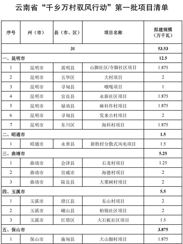 為持續(xù)打造綠色能源強(qiáng)省、大力發(fā)展新能源、助力鄉(xiāng)村振興,云南近日發(fā)布《“千鄉(xiāng)萬(wàn)村馭風(fēng)行動(dòng)”第一批項(xiàng)目開發(fā)建設(shè)方案》(以下簡(jiǎn)稱《方案》),將開發(fā)建設(shè)第一批共31個(gè)風(fēng)電項(xiàng)目,裝機(jī)容量53.53萬(wàn)千瓦。