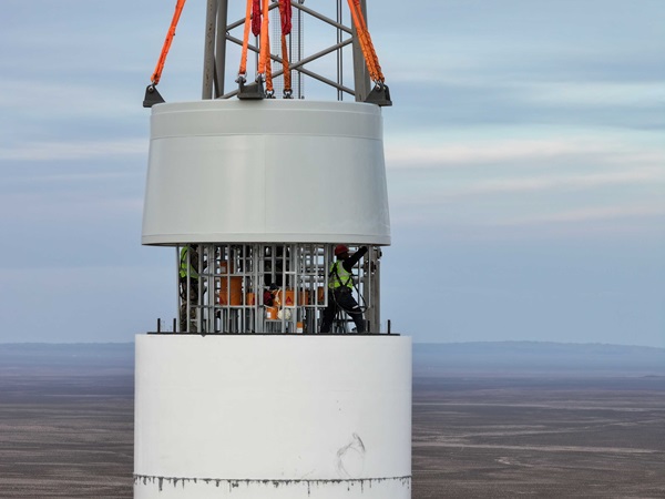 該首臺套風(fēng)電機(jī)組并網(wǎng),標(biāo)志著全球規(guī)?;逃米畲蠡焖L(fēng)力發(fā)電機(jī)組在內(nèi)蒙古能源集團(tuán)成功發(fā)電運(yùn)行。項(xiàng)目使用的風(fēng)電設(shè)備單機(jī)容量10兆瓦,混塔高134.4米,整機(jī)高度140米,葉片長112米,風(fēng)輪直徑230米,覆蓋及掃風(fēng)面積更大,經(jīng)濟(jì)性和發(fā)電量相對更高。值得一提的是,此項(xiàng)目風(fēng)機(jī)塔筒由鋼筋混凝土中空、重力式基礎(chǔ)+上部高強(qiáng)混凝土預(yù)制管片疊合而成,是國內(nèi)首次采用內(nèi)張拉、預(yù)應(yīng)力技術(shù)的10兆瓦混塔風(fēng)力發(fā)電項(xiàng)目。塔筒內(nèi)部預(yù)留孔洞固定鋼纜,鋼纜固定后進(jìn)行水泥灌漿填充縫隙,風(fēng)機(jī)運(yùn)行中旋轉(zhuǎn)產(chǎn)生擺動,使用此技術(shù),在擺動時,塔筒內(nèi)部結(jié)構(gòu)均勻受力,整體擺幅程度大大降低,使塔筒整體性更好、耐久性更強(qiáng)、預(yù)應(yīng)力損失小,混塔結(jié)構(gòu)塔筒優(yōu)勢突出。