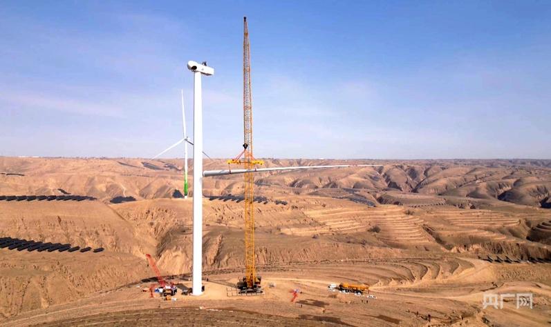 華能慶陽(yáng)風(fēng)光綜合新能源示范項(xiàng)目二批D2風(fēng)光項(xiàng)目風(fēng)機(jī)吊裝現(xiàn)場(chǎng)(央廣網(wǎng)發(fā) 趙小強(qiáng) 攝)