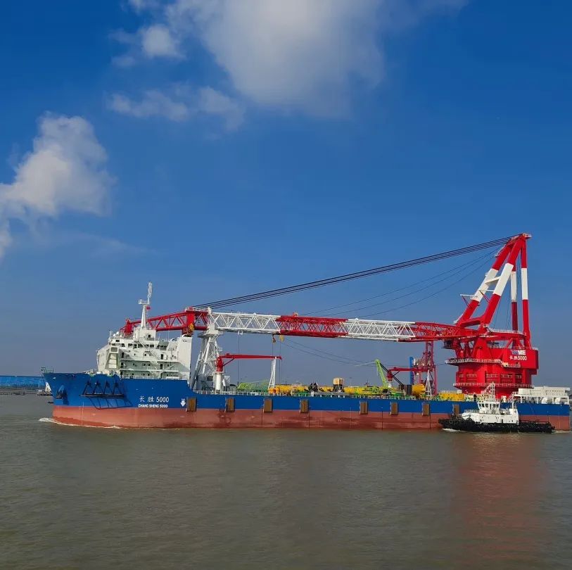 “長勝5000”輪,全長182米,型寬49米,型深15米,最大作業(yè)吃水11米,設(shè)計吃水8米,甲板載荷12T/平方米,起重機固定尾吊狀態(tài)下4000TX40M;全回轉(zhuǎn)狀態(tài)下3000TX40M;主要用于海上風電管樁吊裝作業(yè)及大型構(gòu)件起重作業(yè),由南通振華重型裝備制造。該輪出江后,將直接拖往廣東惠州,致力于海上風電項目建設(shè)。