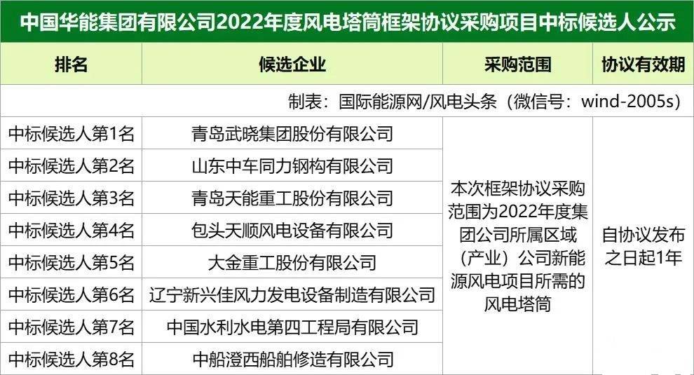 本網(wǎng)訊 近日,中國華能集團(tuán)有限公司2022年度風(fēng)電塔筒框架協(xié)議采購項(xiàng)目中標(biāo)候選人公示。