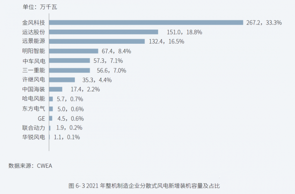 截至2021年年底,整機(jī)制造企業(yè)累計(jì)共16家,其中,分散式風(fēng)電累計(jì)裝機(jī)容量超過50萬千瓦的整機(jī)企業(yè)有金風(fēng)科技、運(yùn)達(dá)股份、遠(yuǎn)景能源、明陽智能、三一重能、中車風(fēng)電,這6家企業(yè)分散式風(fēng)電累計(jì)裝機(jī)容量合計(jì)為890.8萬千瓦,占分散式風(fēng)電累計(jì)裝機(jī)容量的89.4%。
