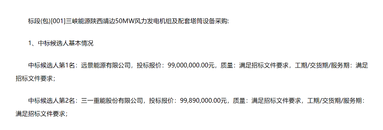 公告顯示,第一中標(biāo)候選人:遠景能源有限公司,投標(biāo)報價:99,000,000.00元。第二中標(biāo)候選人:三一重能股份有限公司,投標(biāo)報價:99,890,000.00元。第三中標(biāo)候選人:明陽智慧能源集團股份公司,投標(biāo)報價:104,000,000.00元。
