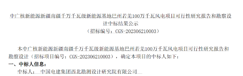 8月10日,中廣核電子商務(wù)平臺(tái)發(fā)布《中廣核新能源新疆南疆千萬千瓦級(jí)新能源基地巴州若羌100萬千瓦風(fēng)電項(xiàng)目可行性研究報(bào)告和勘察設(shè)計(jì)中標(biāo)結(jié)果公示》的公告。