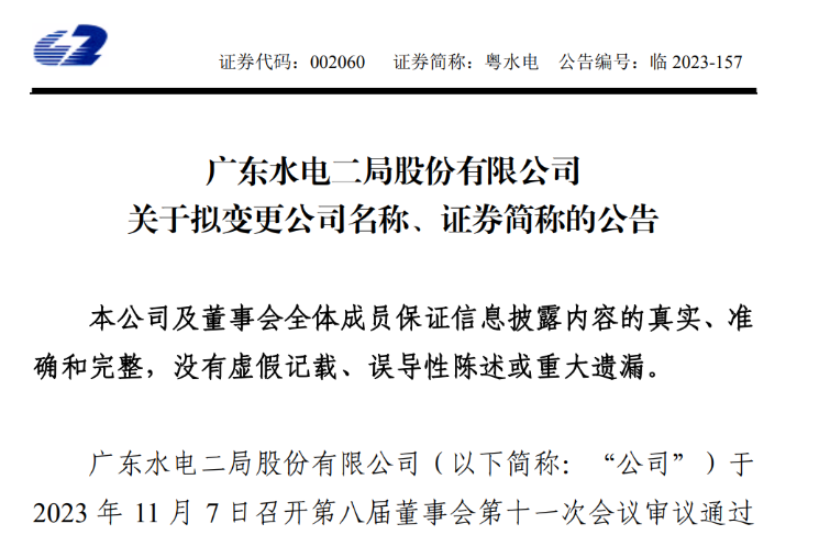 公告披露,粵水電于2023年11月7日召開(kāi)第八屆董事會(huì)第十一次會(huì)議審議通過(guò)《關(guān)于擬變更公司名稱(chēng)、證券簡(jiǎn)稱(chēng)的議案》,同意公司名稱(chēng)由“廣東水電二局股份有限公司”變更為“廣東省建筑工程集團(tuán)股份有限公司”、證券簡(jiǎn)稱(chēng)由“粵水電”變更為“廣東建工”。