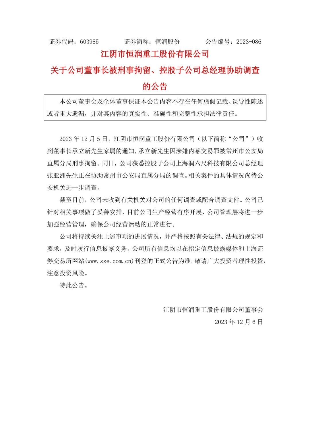 公告顯示, 2023 年 12 月 5 日,江陰市恒潤重工股份有限公司(以下簡稱“公司”)收到董事長承立新先生家屬的通知,承立新先生因涉嫌內幕交易罪被常州市公安局直屬分局刑事留。同日,公司獲悉控股子公司上海潤六尺科技有限公司總經(jīng)理張亞洲先生正在協(xié)助常州市公安局直屬分局的調查。相關案件的具體情況尚待公安機關進一步調查。