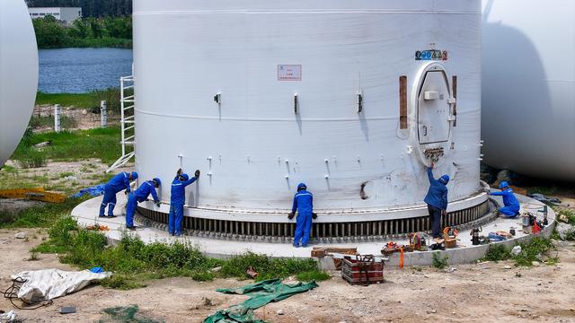 目前全球已經(jīng)開始安裝的最大功率等級(jí)海上風(fēng)電機(jī)組正在廣東省臨海試驗(yàn)基地進(jìn)行塔筒吊裝。潘軍 攝