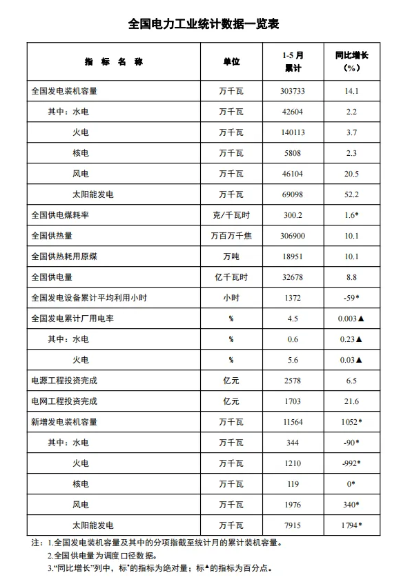 6月28日,國(guó)家能源局發(fā)布1-5月份全國(guó)電力工業(yè)統(tǒng)計(jì)數(shù)據(jù)。