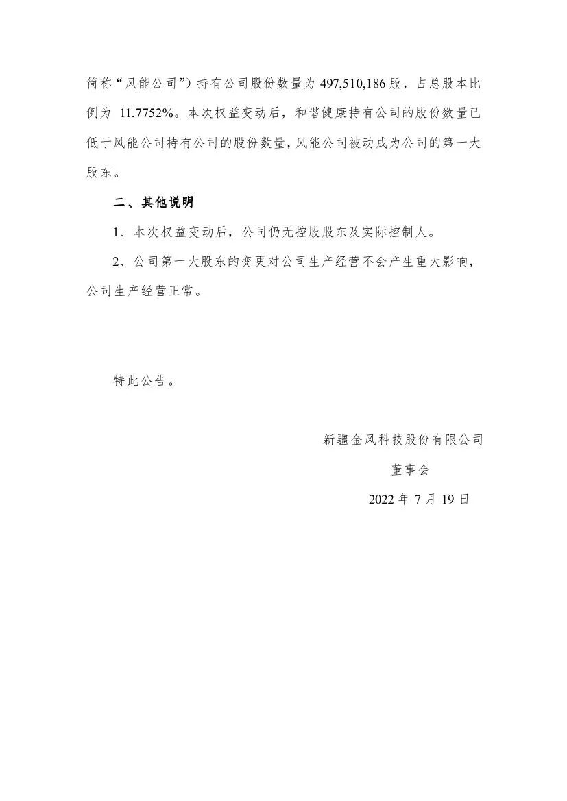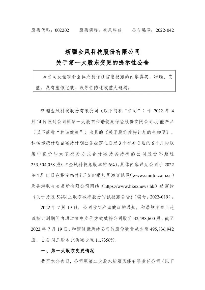 金風(fēng)科技日前發(fā)布《關(guān)于第一大股東變更的提示性公告》。截至2022年7月19日,公司原第一大股東和諧健康保險(xiǎn)股份有限公司-萬(wàn)能產(chǎn)品(簡(jiǎn)稱(chēng)“和諧健康”)所持公司的股份數(shù)量占總股本比例減少至11.7356%,原第二大股東新疆風(fēng)能有限責(zé)任公司(簡(jiǎn)稱(chēng)“風(fēng)能公司”)被動(dòng)成為公司的第一大股東。